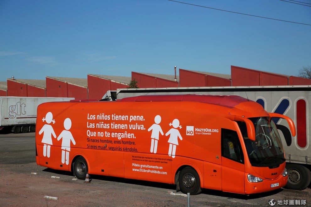 在西班牙當地,一台印有反對跨性人訊息的紅色巴士,靜靜地停在一旁,巴士上寫到「男孩有陰莖,女孩有陰道,別讓他們愚弄你,如果你出生時是男生,你就是男生,如果你出生時是女生,你也會繼續是女生」。