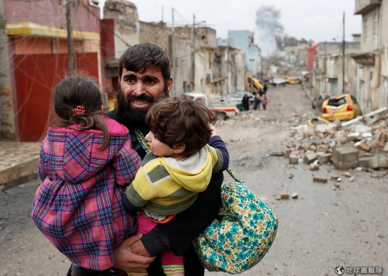 一名男子抱著小孩逃離摩蘇爾城(Mosul),當地目前是伊拉克當局和伊斯蘭國(IS)恐怖分子的對戰前線,遠方冒出的陣陣硝煙令人心驚。