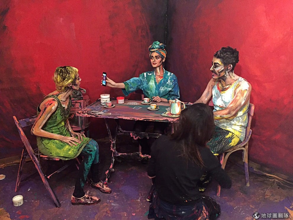 開羅藝術家阿里芙(Chanel Arif)小心翼翼地為真人塗上繪畫顏料,希望可以塑造出油畫的質感,讓她的作品「晚餐後」更能傳達出她的創作理念。