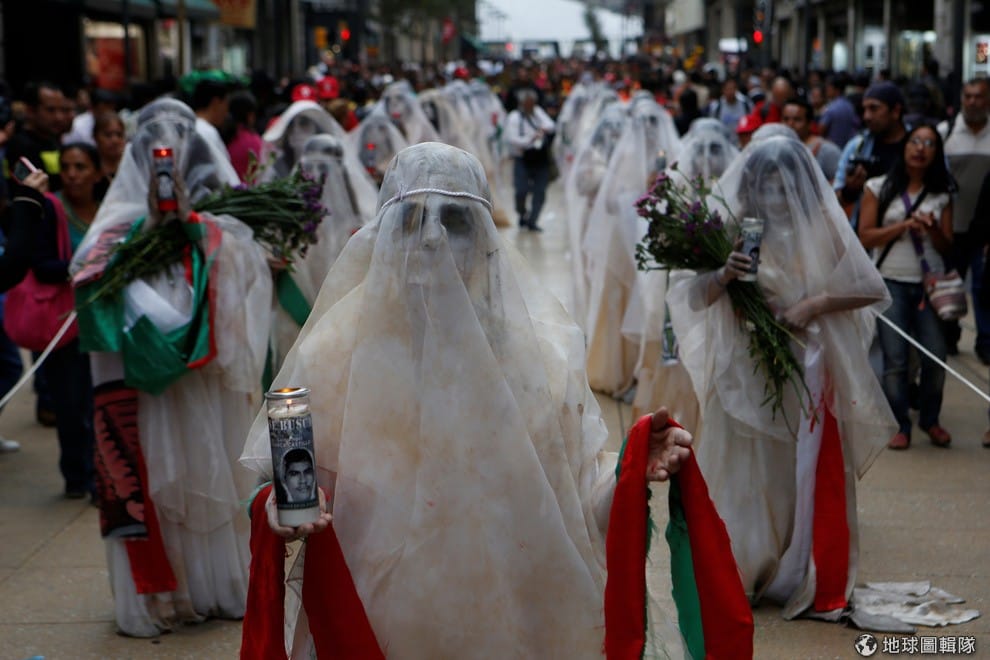 一群女子畫上蒼白的妝容,手上捧著印有 43名「阿約辛阿帕農村教師大學」(Ayotzinapa Teacher Training College)學生照片的蠟燭,抗議當局沒有好好搜尋,這些學生到現在依然下落不明。