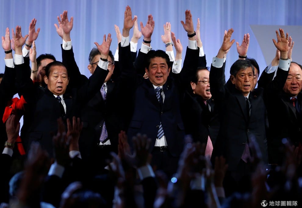 在一年一度的自民黨大會上,日本首相兼自民黨黨魁的安倍晉三(圖中)帶領黨員舉手高喊萬歲。