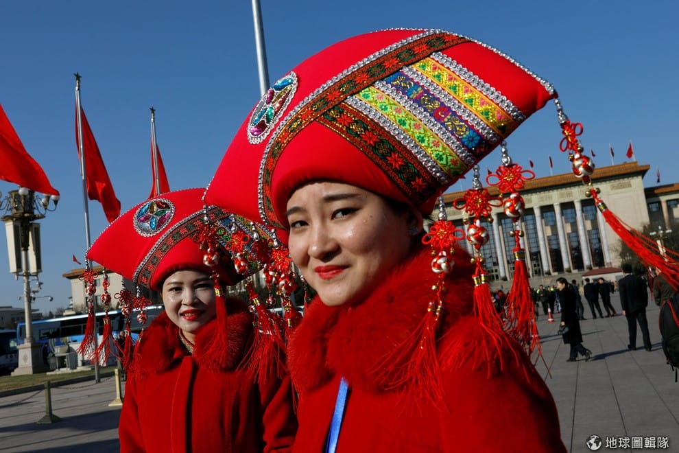 在北京人民大會堂前,頭戴具有中國風情頭飾的禮賓員對著鏡頭露出笑容,她們負責接待前來參加中國人民代表大會的賓客。