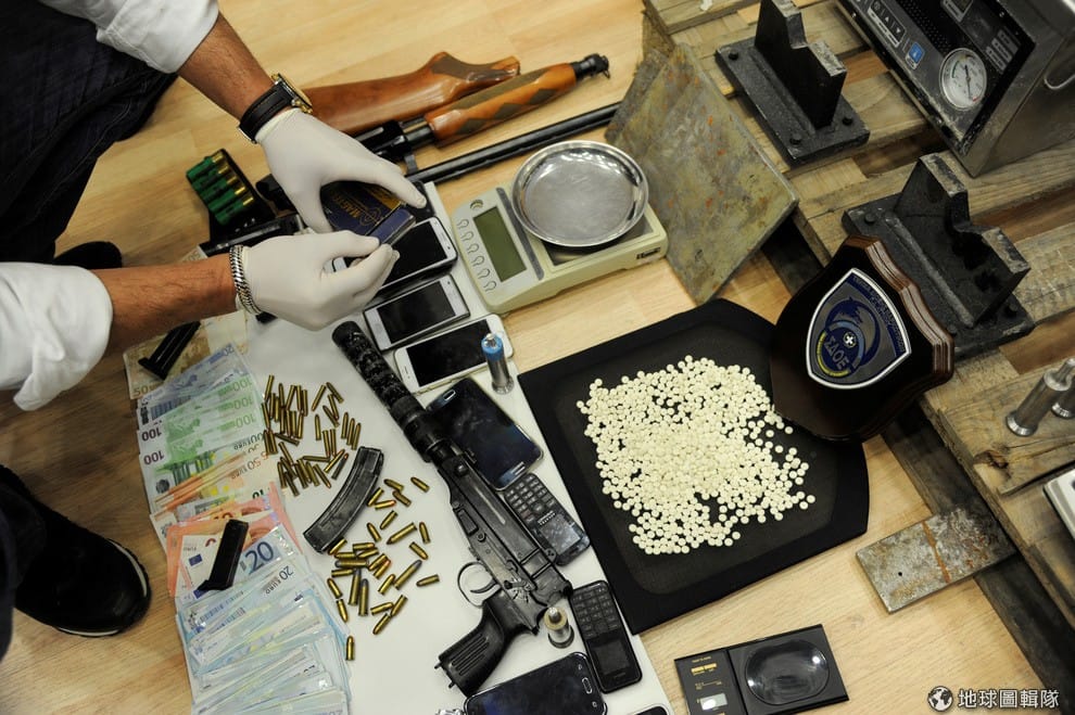 破獲犯罪集團的雅典警方向外界展示他們沒收的槍枝、贓款以及安非他命藥片。