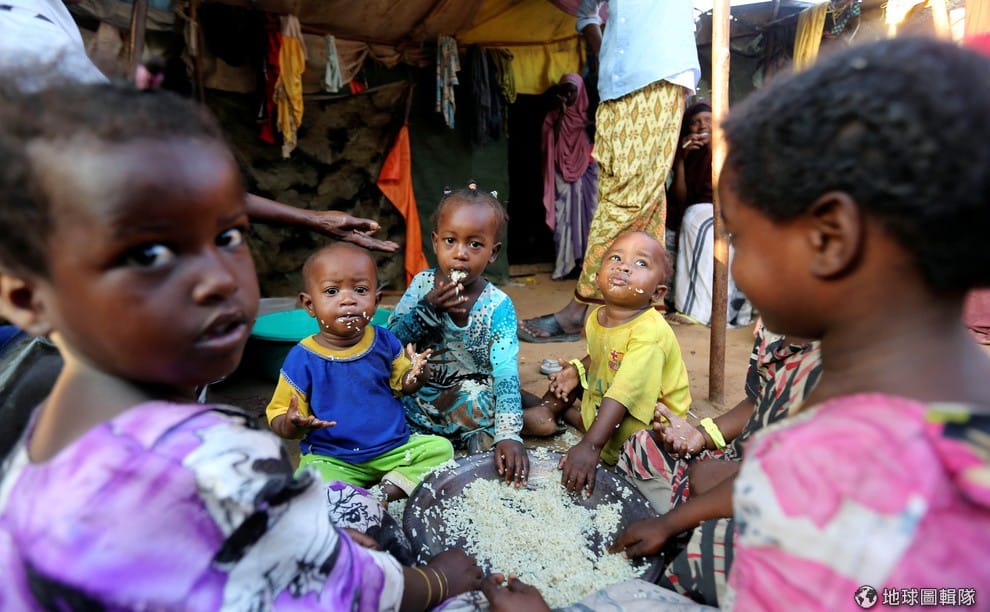 因為內戰流離失所的孩童在難民營中吃午餐,他們和父母一起從戰亂的家園逃出,許多人都出現營養不良的狀況。
