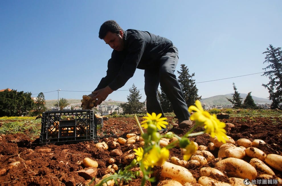 一名農夫在西岸村落的田中採收馬鈴薯,享受大地的恩賜。