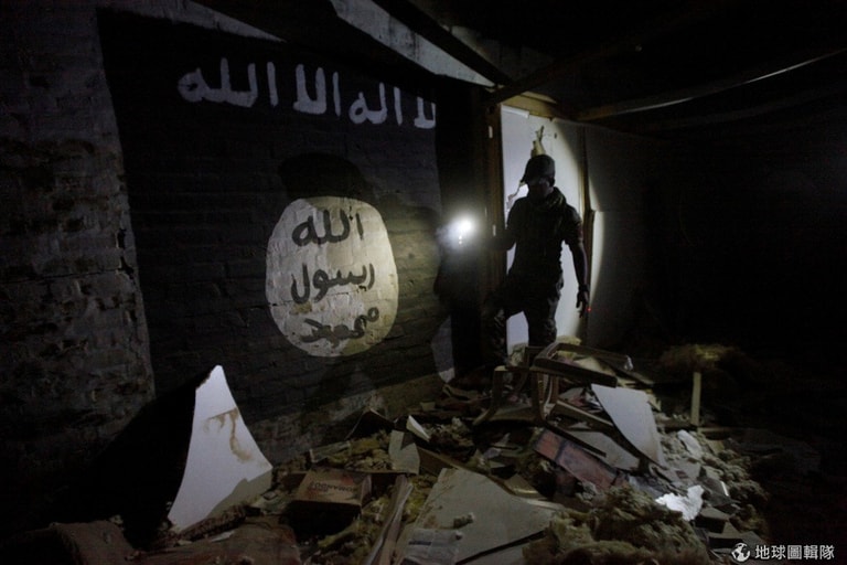 在伊斯蘭國(IS)位於摩蘇爾城(Mosul)的地下訓練營中,伊拉克政府軍發現牆面上被畫上了伊斯蘭國的黑色旗幟。