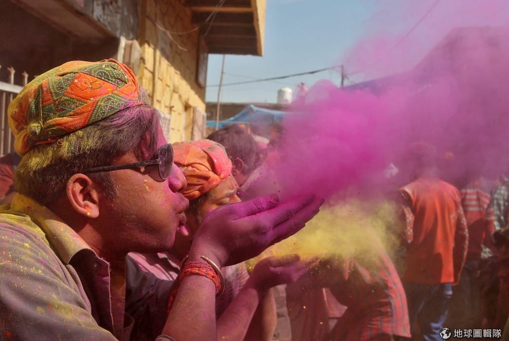 一名男子將粉紅色的彩粉吹向空中,慶祝色彩節(Holi)的到來,這天人們除了用彩粉迎接春天的到來,也慶祝善良戰勝邪惡。