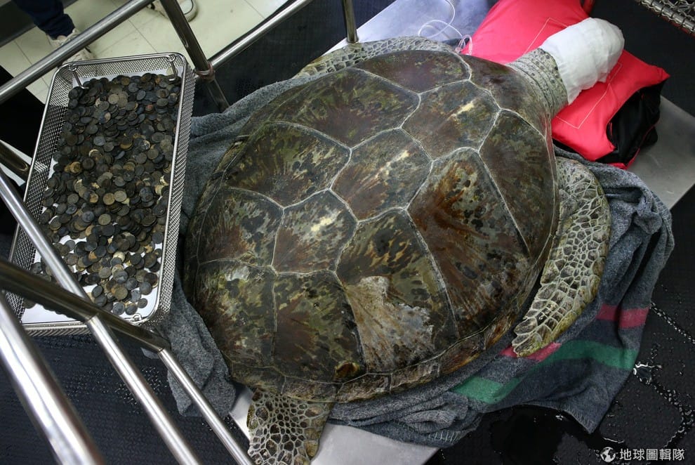 今年 25歲的綠蠵龜奧辛(Omsin)趴在毯子上休息,牠剛剛經歷了一場手術,獸醫從牠的胃中取出大量錢幣,這些錢幣就被放在一旁的托盤上。奧辛生活在曼谷當地的池塘中,池塘常常被民眾當作許願池投擲錢幣,造成奧辛誤食肚子裡裝滿了大量錢幣,危害健康。
