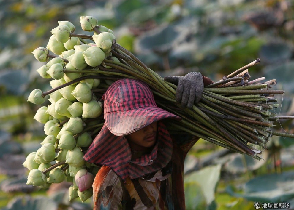 一名男子將蓮花池中一朵朵含苞待放的蓮花從根部切斷,扛在肩上準備賣給客人。