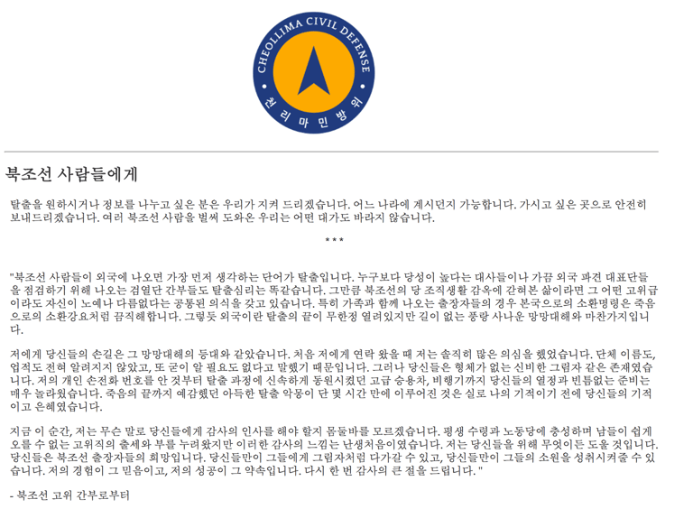 上傳這支影片的是自稱「千里馬民防」(Cheollima Civil Defense)的不知名組織,在他們的聲明網站上表示,「千里馬民防」是為了保護金正男一家而緊急設立,三名家庭成員已經重新安置到安全的地方,他們不會透露所在地的細節。與此同時,「千里馬民防」提到他們急需各界協助,並在聲明中留下加密email和比特幣帳戶。