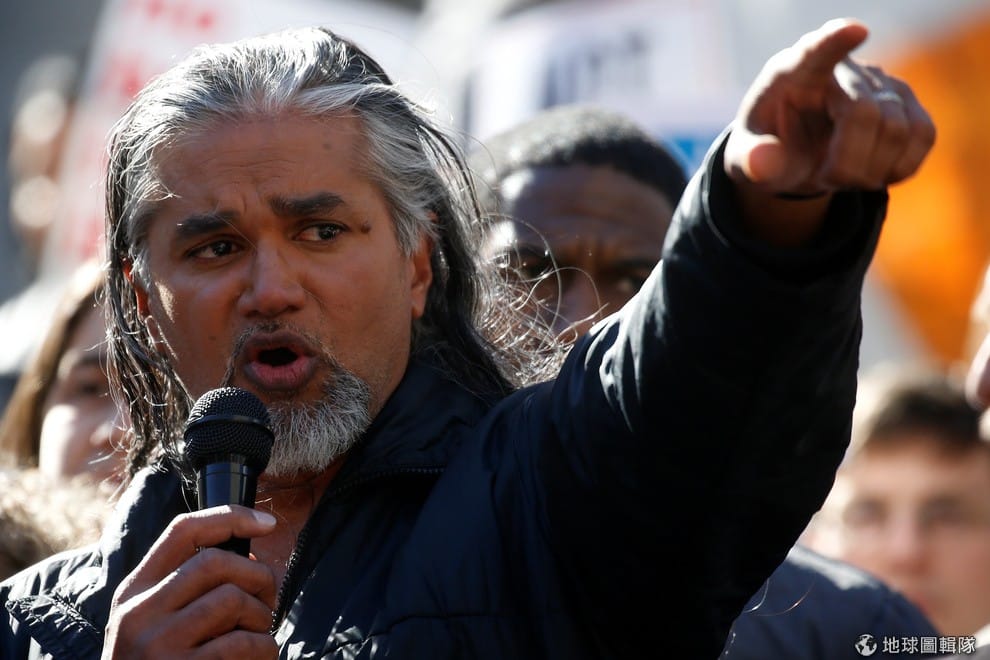在紐約公民與移民服務局前,從加勒比海地區的千里達(Trinidad)移民到美國的瑞格博(Ravi Ragbir)站在第一線為移民爭取權利,抗議美國總統川普(Donald Trump)近日簽署的旅行禁令。