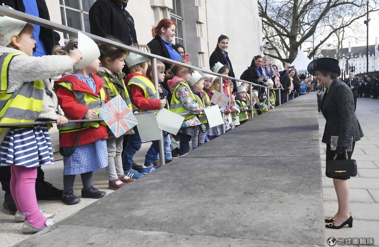 9號這天,英國首相梅伊(Theresa May)和手拿英國國旗的孩童打招呼,她剛剛結束完為紀念碑揭幕的活動,這塊紀念碑是為了紀念在伊拉克和阿富汗傷亡的將士而設。