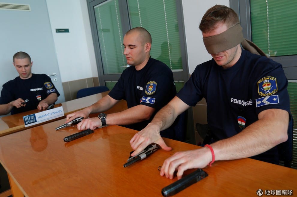 匈牙利邊界警察正在練習蒙著眼睛組裝手槍。