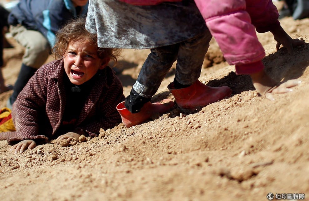 一名小女孩在逃離伊拉克政府軍和伊斯蘭國(IS)對戰的前線時摔了一跤,其他人則手腳並用地趕快前往位於摩蘇爾城(Mosul)南部的難民營避難。