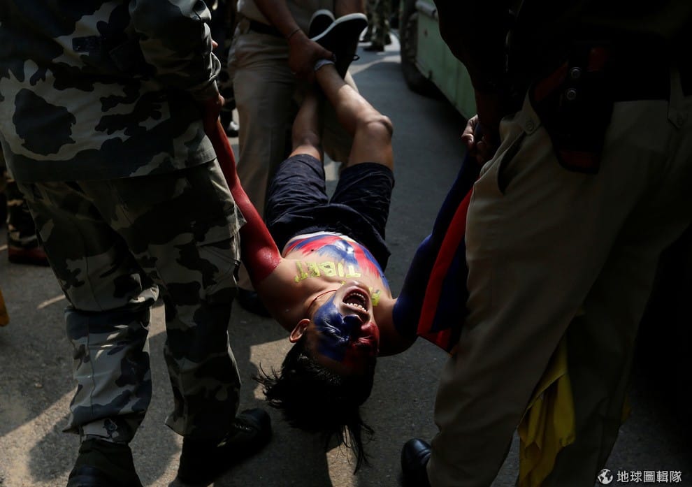 在中國駐新德里大使館外,西藏獨立運動人士將身體彩繪上西藏旗幟的顏色,大聲抗議中國政府壓迫西藏民眾,以此紀念 1959年西藏起義滿 58周年。
