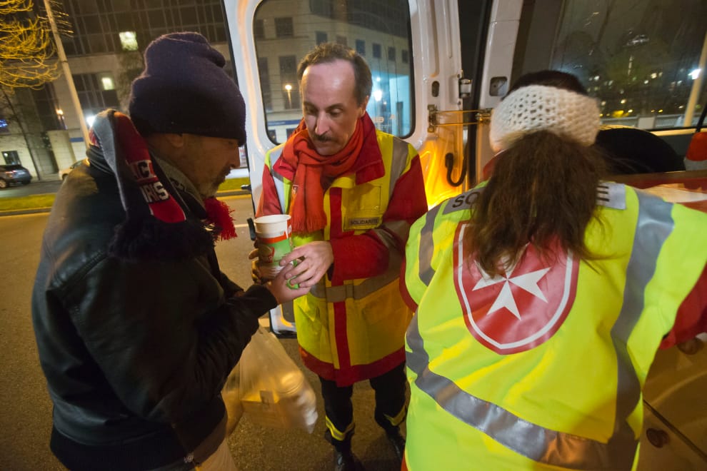 目前,馬爾他騎士團的志工積極地在世界各地執行人道救援任務,圖為在寒冷的法國巴黎郊區援助無家可歸者的馬爾他騎士團志工。