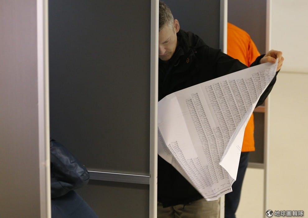 一名男子在投票所裡展開列出所有政黨的選票。荷蘭是個多黨制國家,而這次一共有 28個政黨參與國會大選。