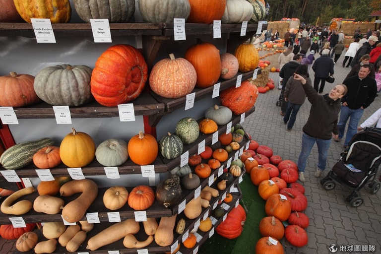 德國當地展出了429種的南瓜,各種奇形怪狀、色彩跳躍的南瓜被排排坐的放在架子上讓觀光客觀賞。圖片來源:Sean Gallup/Getty Images