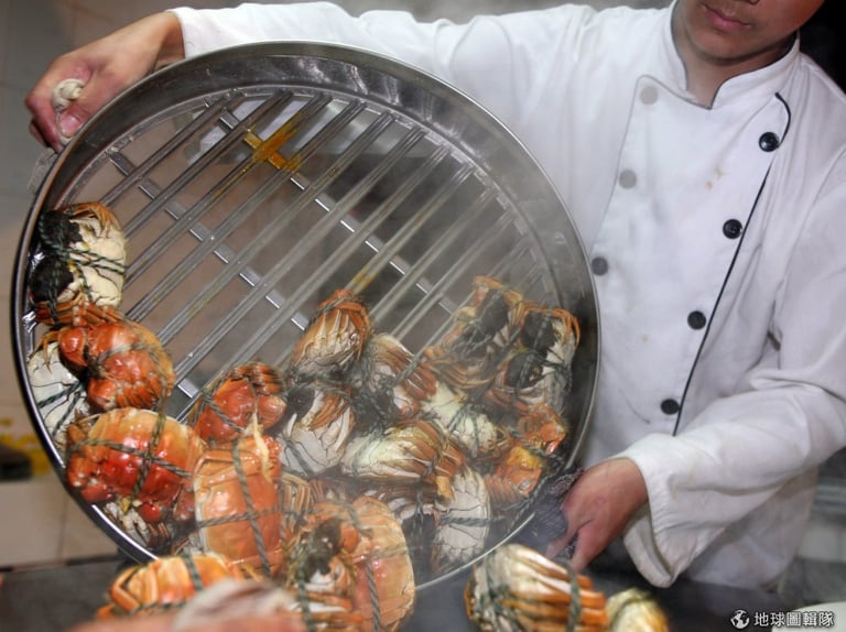 秋天對台灣來說,也是大啖螃蟹的時節,廚師正要把蒸熟的美味螃蟹擺盤上桌!圖片來源:China Photos/Getty Images