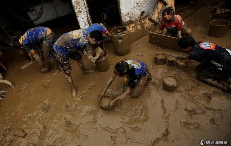 志工正協助人們清理因洪患而一片狼藉的家園。秘魯連日來不尋常的暴雨,使得各地均出現洪患災情,所幸洪水已經逐漸退去。