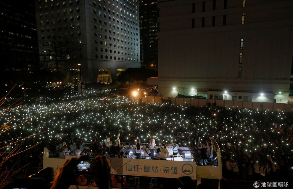香港即將在 26號舉辦特首選舉。照片拍到了候選人之一的曾俊華在造勢晚會上的畫面。