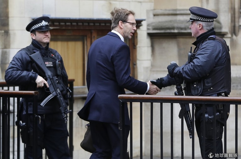 英國下議院議員埃伍德(Tobias Ellwood)在進入議會前,向警戒在門口的武裝警察握手致意。
