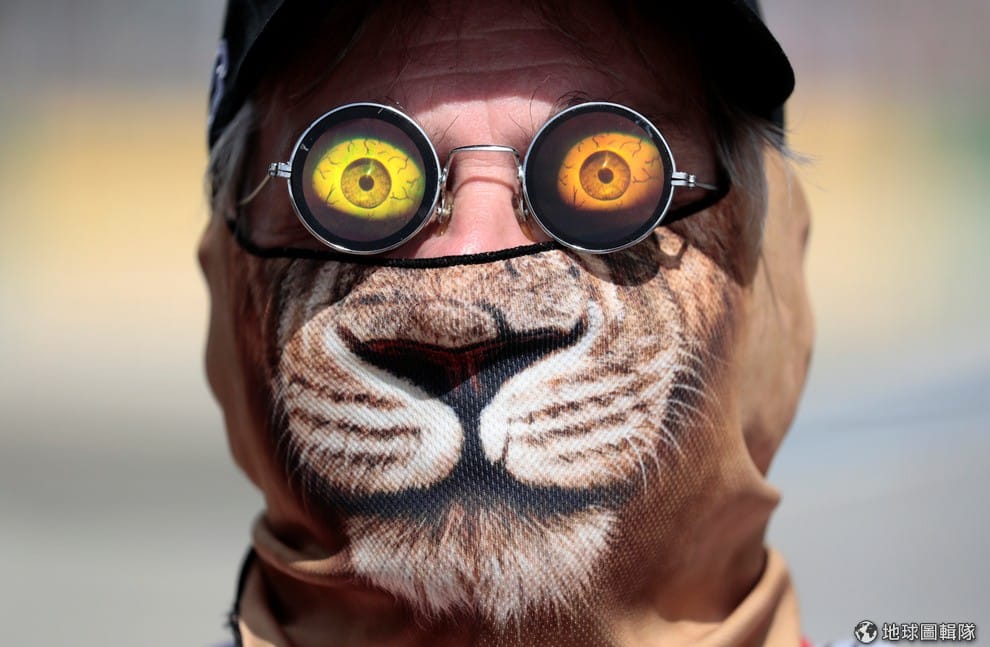 在澳洲墨爾本(Melbourne)的F1賽車場,一名戴著貓面罩跟 3D效果眼鏡的工作人員,張羅著在 26號開跑的 2017年一級方程式(F1)賽車。