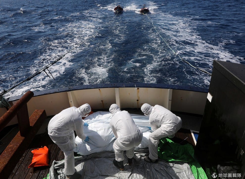 西班牙的非營利組織海上難民救援隊(Proactiva OpenArms)的工作人員正忙著把找到的移民遺體消毒。