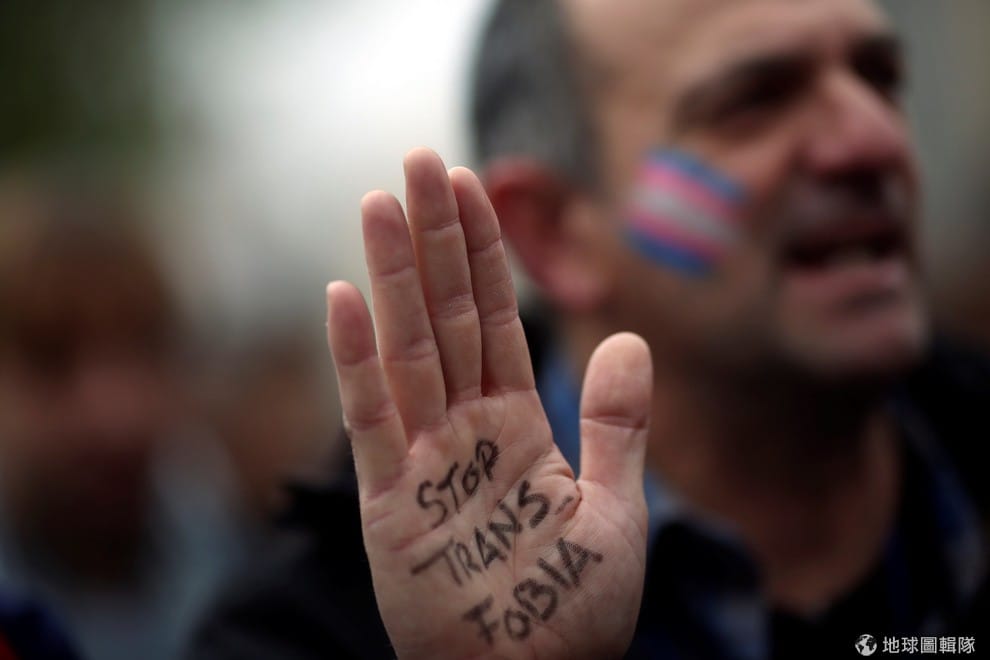 一名男子舉起寫有「停止害怕跨性別族群」字樣的手掌,和民眾一起在首都馬德里街頭為跨性別族群請命。