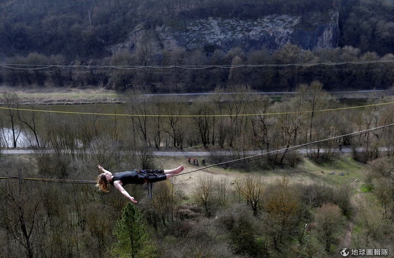 一名女子躺在高掛在空中的一條線上,全身重量只靠這條線維持平衡,這是當地最新流行的一種紓壓方式。