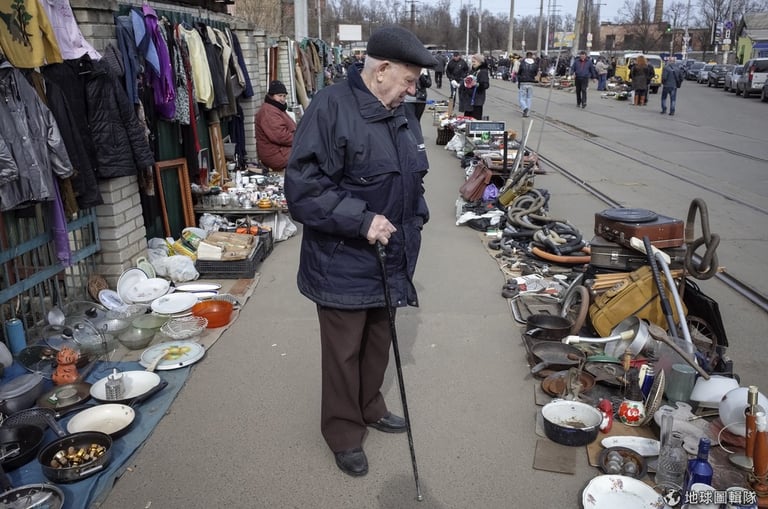 在首都基輔(Kiev),一名老翁拄著枴杖在路旁的二手市集挖寶。