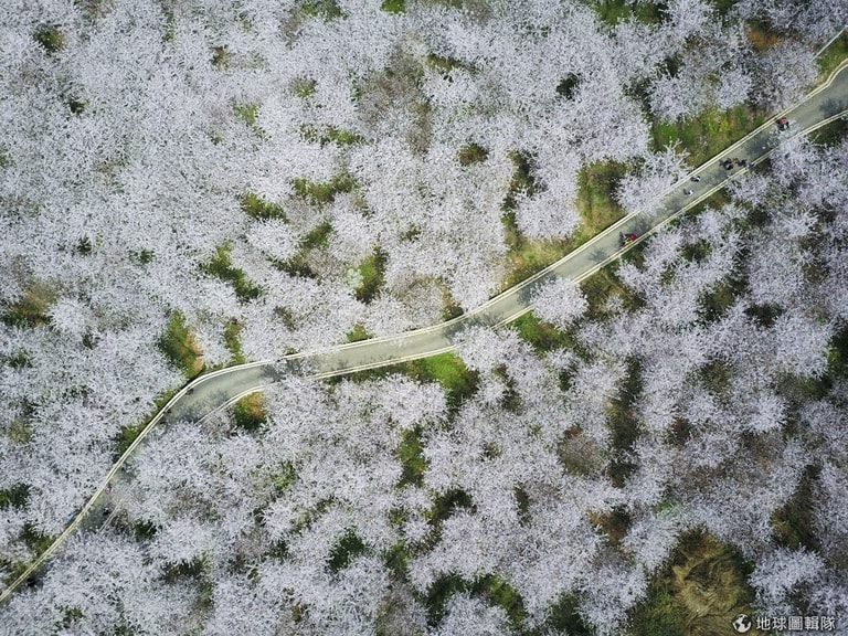 在廣州貴安新區,春櫻沿路綻放,從空中鳥瞰令人驚豔。
