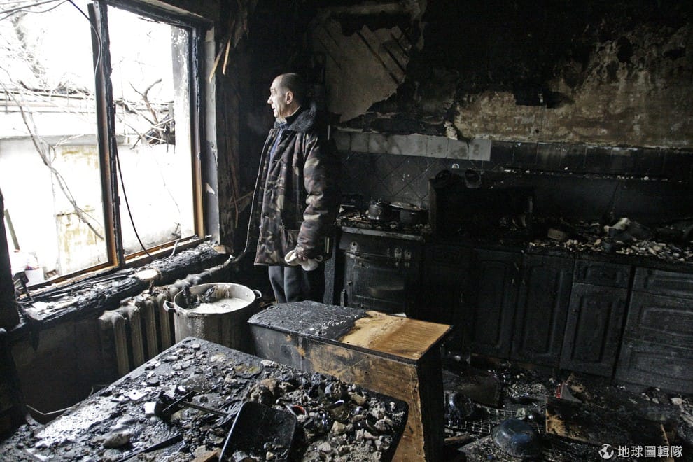 一名男子站在被轟炸地面目全非的家園,這裡是自行宣布從烏克蘭獨立的頓內次克州(Donetsk),目前由親俄的反政府軍把持。