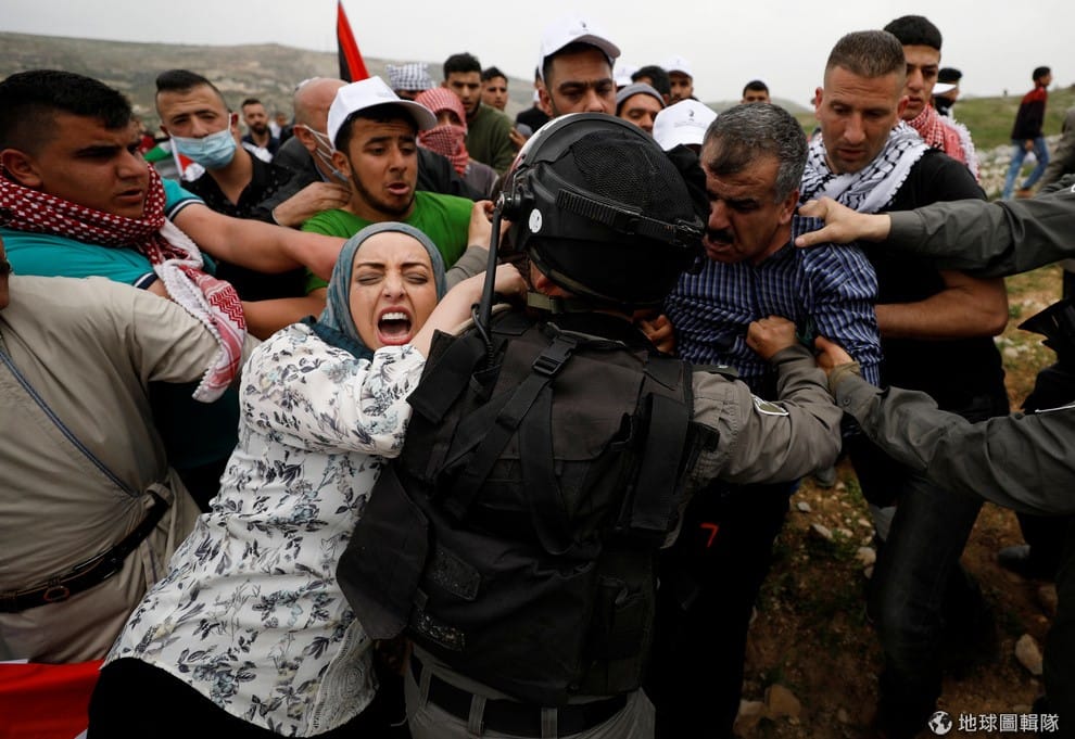 神情激動的巴勒斯坦人上前阻止以色列軍人帶走紀念「土地日」(Land Day)的同胞。