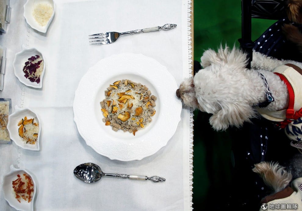 一隻寵物狗目不轉睛地盯著專為牠烹調的美食,等待主人一聲令下準備大快朵頤。