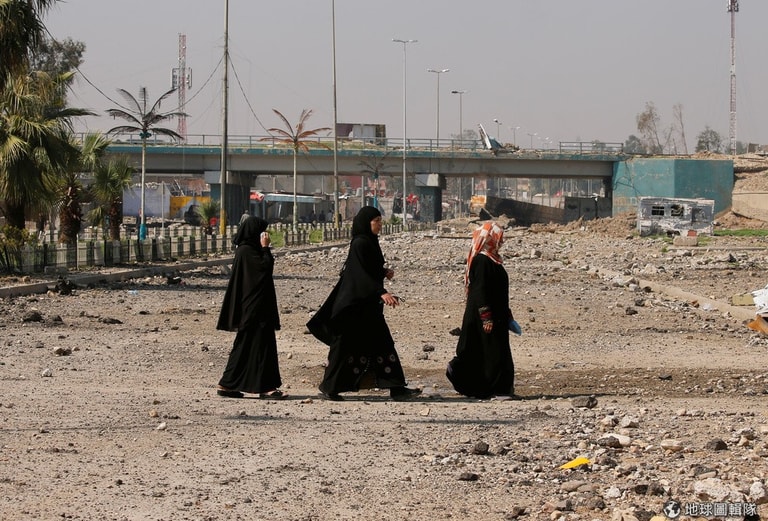 三名伊拉克女子走過被戰亂洗禮的摩蘇爾城(Mosul)西部,現在這裡已經被當局從伊斯蘭國(IS)的手中收復。