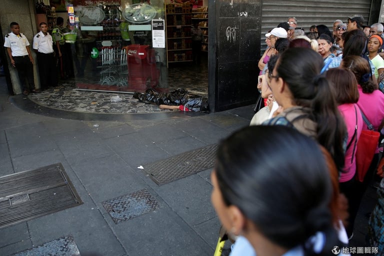 一名男子倒在首都卡拉卡斯(Caracas)一間超市前,他排隊買東西排到一半突然死亡,周圍民眾邊排隊邊關心發生了什麼事。