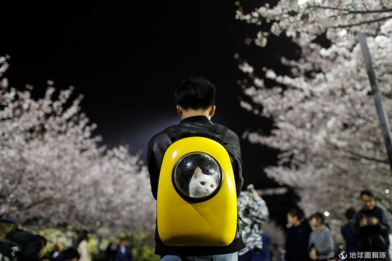在開滿櫻花的上海同濟大學中,一名男子揹著一隻白貓走在校園中,白貓透過觀景窗好奇地往外看。