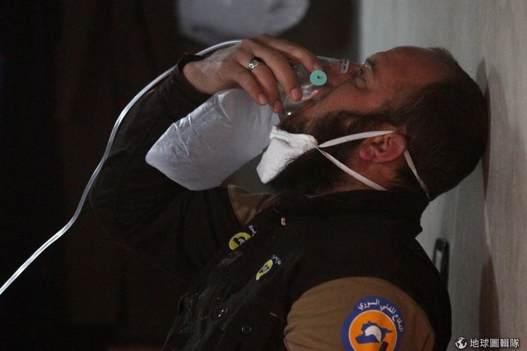 一名敘利亞白帽救援隊的成員大口吸著氧氣,他剛剛遭到化武攻擊。在反政府軍把持的伊德利卜省(Idlib)汗舍孔鎮(Khan Sheikhun)傳出遭到化武攻擊,造成超過 50人喪命,300多人受傷。現在國際社會把矛頭指向敘利亞當局,但當局維持一貫立場否認使用化武,也否認使用被稱為「窮人的化武」的氯氣彈。
