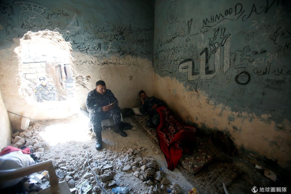 光線從圍牆外透進室內,照進正在休息的伊拉克軍人身上,待會他們又要到前線和伊斯蘭國(IS)恐怖分子決一死戰。