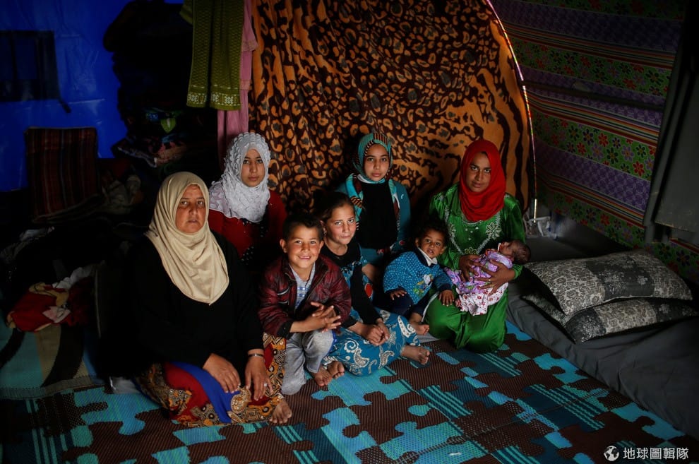 今年 45歲的依布拉辛(Hanyeih Ibraheem,左一)帶著一家大小逃離位於戰爭前線的摩蘇爾城(Mosul)西部,來到摩蘇爾城南部的難民營避難,拍照這天她的兒子離開帳篷出門找工作。