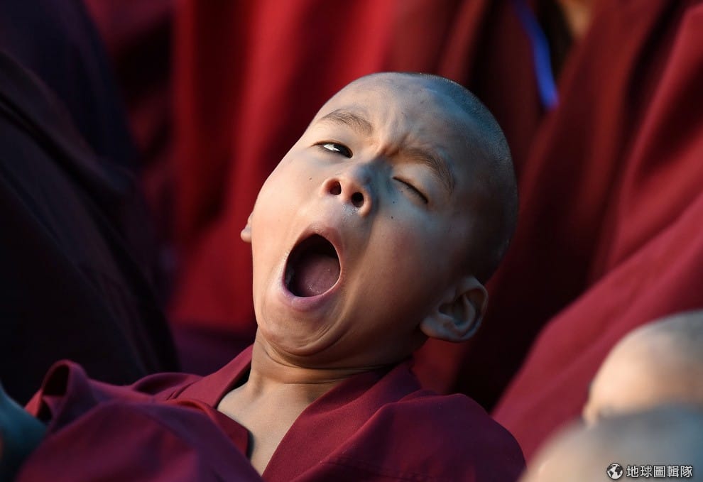 一名小和尚在西藏精神領袖達賴喇嘛的演講上,忍不住打了一個好大的呵欠。