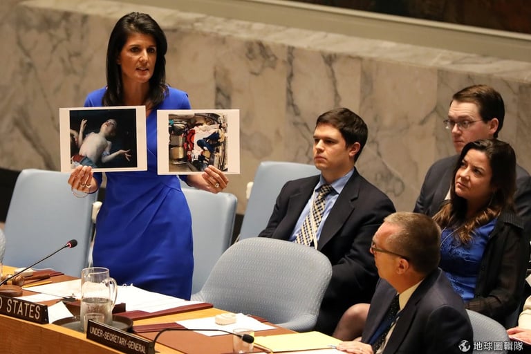 5號這天,美國駐聯合國代表哈利(Nikki Haley)手上拿著遭化武攻擊的敘利亞孩童照片,譴責這次發動攻擊的兇手。
