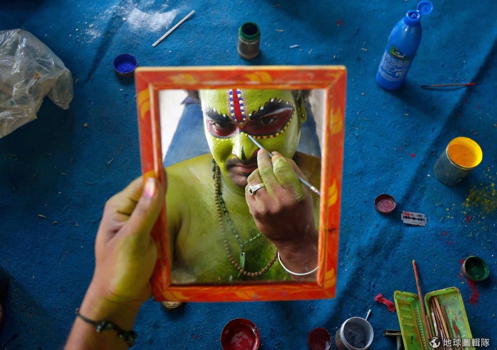 為了慶祝印度神祇羅摩(Rama)的生日,一名藝術家在臉上畫上細緻的妝容,準備登台表演。