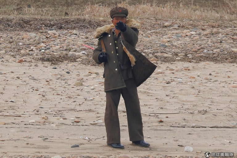 一名北韓軍人站在鴨綠江邊,對著搭船在江上欣賞美景的中國遊客提出警告。