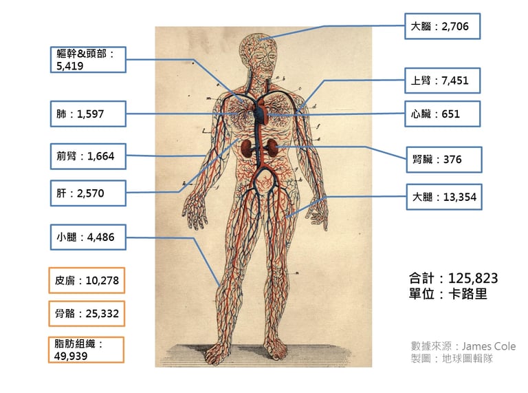 柯爾利用文獻數據推敲出人體作為大餐有多少熱量,結論是一個重 66公斤的男性大約可以提供 12萬5,823卡路里的熱量,然而如果和其他史前動物相比,人類作為一餐提供的熱量並不多。舉例來說,一隻長毛象可以提供 360萬卡路里的熱量,一匹馬則是 20萬100卡路里,一隻紅鹿是 16萬3,680卡路里。