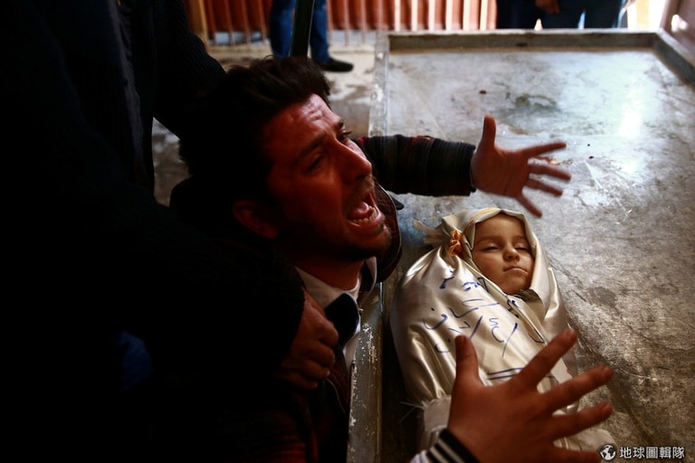 今年 25歲的史卡夫(Salah Skaff)傷心欲絕地在年僅一歲半的女兒愛米拉(Amira Skaff)的遺體旁哭泣,愛米拉在政府軍空襲反政府軍把持的大馬士革(Damascus)杜馬市(Douma)時喪生。