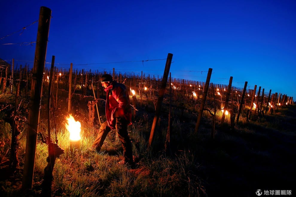 酒莊葡萄栽種者葛雷伯(Daniel Grab)在葡萄園外升起大火,好保護遭受低溫襲擊的葡萄藤。