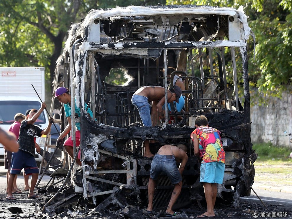在巴西北部經濟城市福塔萊薩(Fortaleza),人們正在清理被焚燬的巴士。