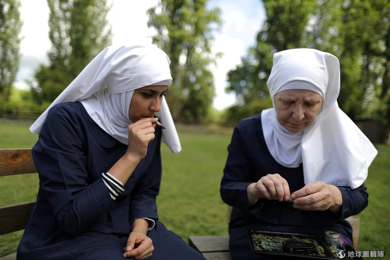 兩名修女一邊共享大麻菸,一邊忙著手頭上的工作。在加州,有一群修女專門處理藥用大麻為人們治病,這個組織是「山谷的姊妹」(The Sisters of the Valley),當地人則將她們稱為「大麻修女」。